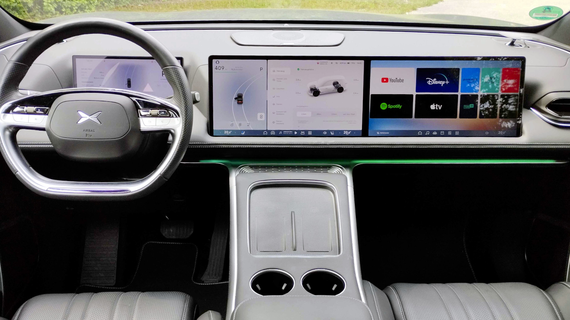 An USB- und 12-V-Anschlüssen herrscht kein Mangel. Induktives Laden ist mit zwei Smartphones möglich. Nur ein Head-up-Display vermisst man im XPeng G9. Dazu fehlen Individualisierungsmöglichkeiten für das Digitalinstrument. Es ist beispielsweise nicht möglich, die Navigationsansicht direkt hinter dem Lenkrad aufzurufen. Dafür muss umständlich der Blick abgewandt und auf den zentralen Bildschirm gelenkt werden. Umso praktischer ist es, dass Mitfahrende auf dem Nebensitz ihren eigenen Bildschirm zum Herumspielen bekommen.